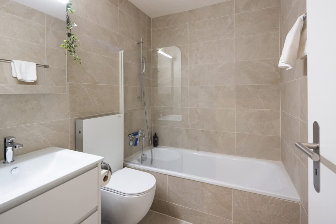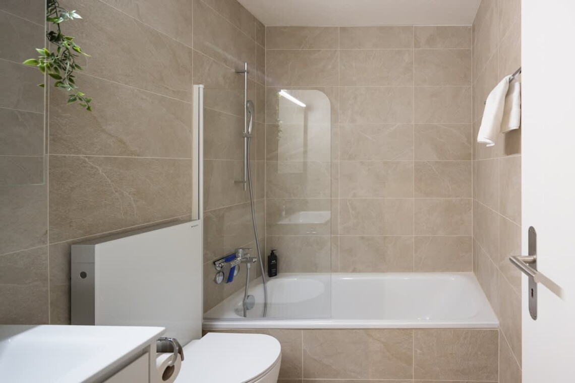The bedroom welcomes you with a king-size box spring bed and hotel-quality linen – the difference from an ordinary rental is felt on the very first evening. The bathroom offers something genuinely rare in the area: a bathtub. Fill it up, let the day go.